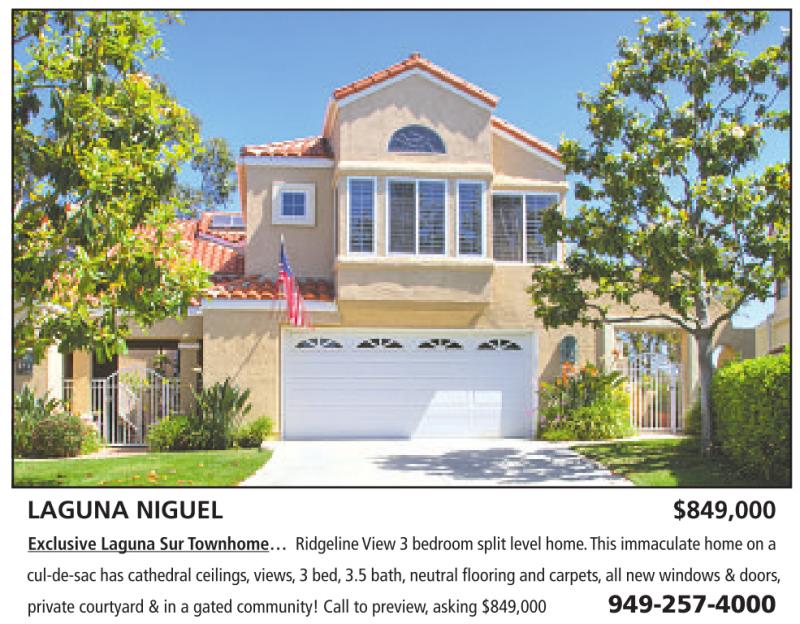 LAGUNA NIGUEL $849,000 Exclusive Laguna Sur Townhome… Ridgeline View 3bedroom split level home.This immaculate home on a cul-de-sac has cathedral ceilings,views,3bed, 3.5 bath, neutral flooring and carpets,all new windows &doors, private courtyard &inagated community! Call to preview,asking $849,000 949-257-4000
