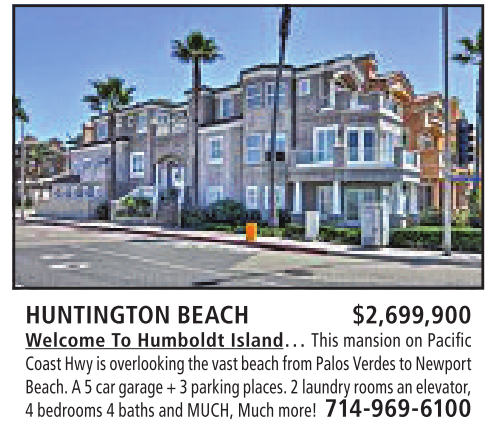 HUNTINGTON BEACH $2,699,900 Welcome To Humboldt Island… This mansion onPacific CoastHwy is overlooking thevastbeachfrom PalosVerdes to Newport Beach.A5car garage+3parking places. 2laundry roomsanelevator, 4bedrooms 4baths andMUCH, Much more! 714-969-6100