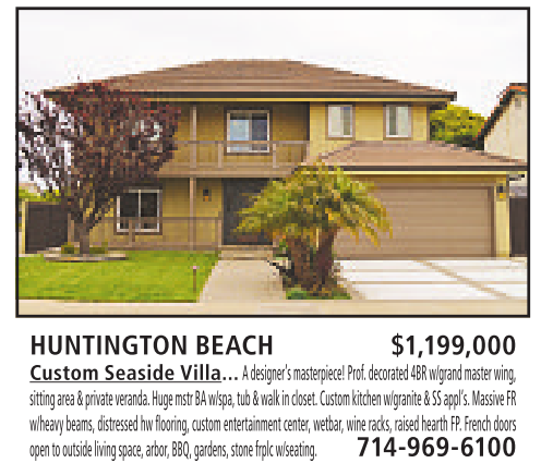 HUNTINGTON BEACH $1,199,000 Custom Seaside Villa... Adesigner’s masterpiece!Prof. decorated4BR w/grand master wing, sittingarea&private veranda. HugemstrBAw/spa,tub &walk in closet.Customkitchen w/granite &SSappl’s. MassiveFR w/heavy beams, distressed hwflooring, custom entertainment center, wetbar, wine racks, raised hearth FP. French doors opentooutside living space,arbor,BBQ,gardens,stonefrplc w/seating. 714-969-6100