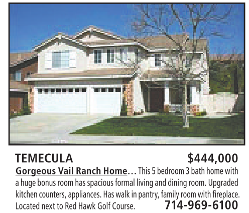 TEMECULA $444,000 GorgeousVailRanch Home… This 5bedroom3bathhome with ahugebonus room hasspacious formal living anddiningroom. Upgraded kitchen counters, appliances. Haswalk in pantry,familyroomwithfireplace. Located next to RedHawkGolf Course. 714-969-6100