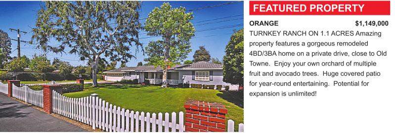 FEATURED PROPERTY ORANGE $1,149,000 TURNKEY RANCH ON 1.1 ACRES Amazing property features a gorgeous remodeled 4BD/3BA home on a private drive, close to Old Towne. Enjoy your own orchard of multiple fruit and avocado trees. Huge covered patio for year-round entertaining. Potential for expansion is unlimited!