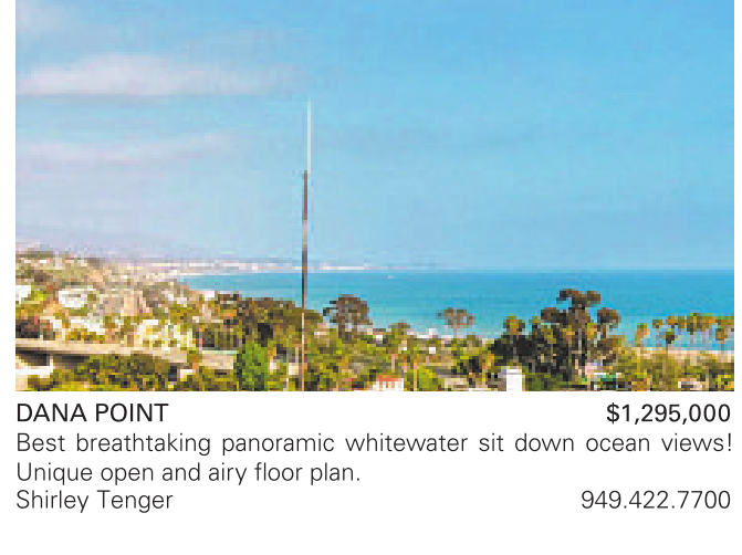 DANA POINT $1,295,000 Best breathtaking panoramic whitewater sit down ocean views! Unique open and airy floor plan. Shirley Tenger 949.422.7700
