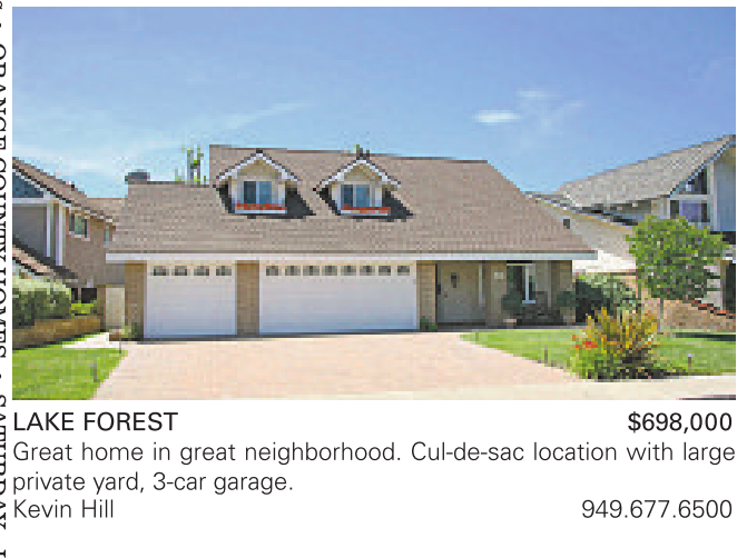 LAKE FOREST $698,000 Great home in great neighborhood. Cul-de-sac location with large private yard, 3-car garage. Kevin Hill 949.677.6500