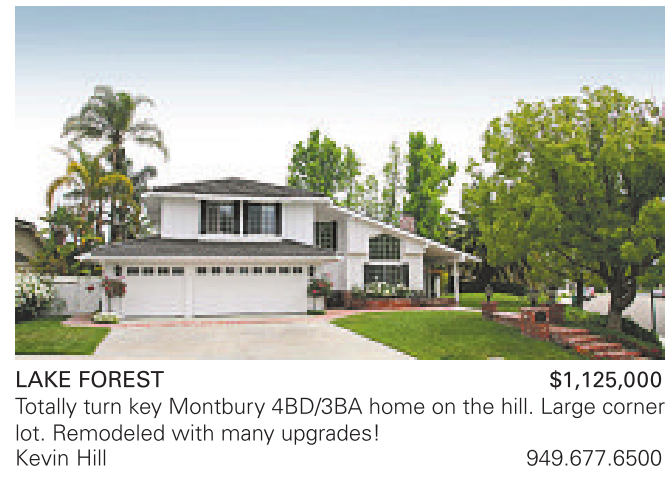 LAKE FOREST $1,125,000 Totally turn key Montbury 4BD/3BA home on the hill. Large corner lot. Remodeled with many upgrades! Kevin Hill 949.677.6500