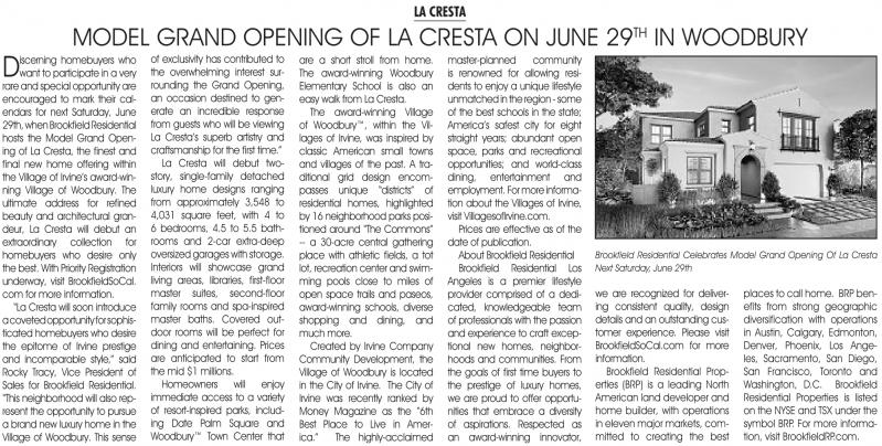 encouraged to mark their calendars for next Saturday, June 29th, when Brookfield Residential hosts the Model Grand Opening of La Cresta, the finest and final new home offering within the Village of Irvine’s award-winning Village of Woodbury. The ultimate address for refined beauty and architectural grandeur, La Cresta will debut an extraordinary collection for homebuyers who desire only the best. With Priority Registration underway, visit BrookfieldSoCal. com for more information.