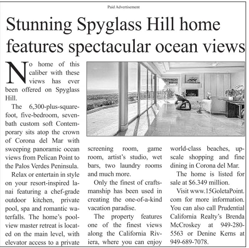 world-class beaches, upscale shopping and fine dining in Corona del Mar. The home is listed for sale at $6.349 million. Visit www.15GoletaPoint. com for more information. You can also call Prudential California Realty’s Brenda McCroskey at 949-280- 5563 or Denine Kerns at 949-689-7078. No home of this caliber with these views has ever been offered on Spyglass Hill. The 6,300-plus-squarefoot, five-bedroom, sevenbath custom soft Contemporary sits atop the crown of Corona del Mar with sweeping panoramic ocean views from Pelican Point to the Palos Verdes Peninsula. Relax or entertain in style on your resort-inspired lanai featuring a chef-grade outdoor kitchen, private pool, spa and romantic waterfalls. The home’s poolview master retreat is located on the main level, with elevator access to a private Paid Advertisement Stunning Spyglass Hill home features spectacular ocean views screening room, game room, artist’s studio, wet bars, two laundry rooms and much more. Only the finest of craftsmanship has been used in creating the one-of-a-kind vacation paradise. The property features one of the finest views along the California Riviera, where you can enjoy