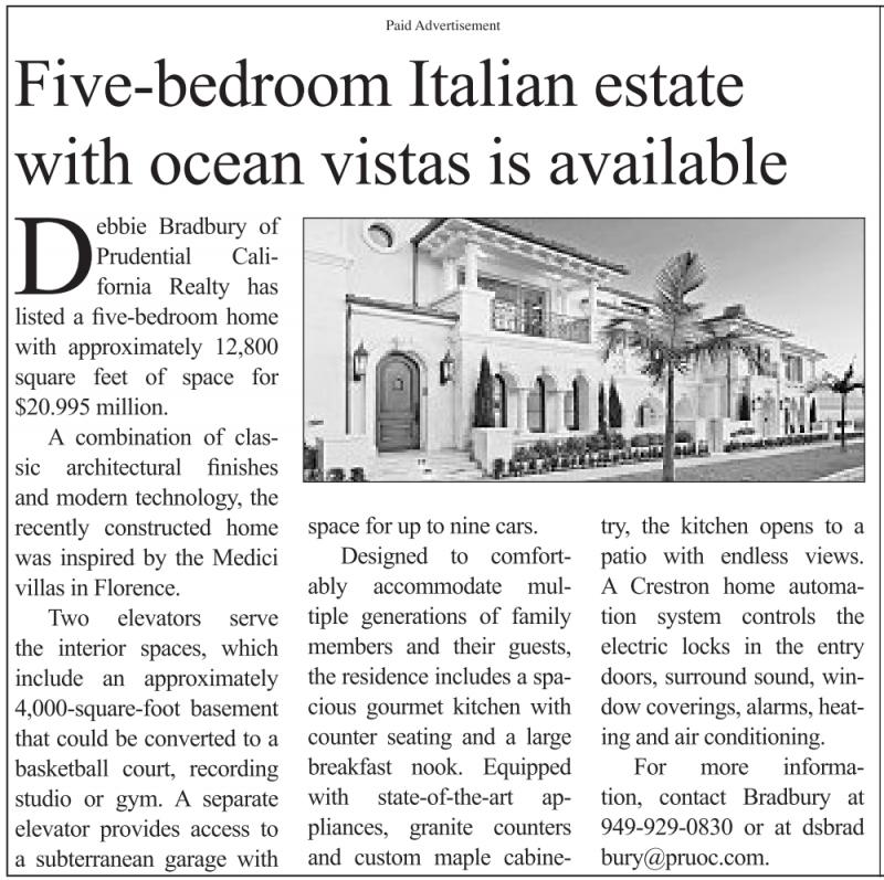 Bradbury of Prudential California Realty has listed a five-bedroom home with approximately 12,800 square feet of space for $20.995 million.