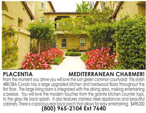 PLACENTIA MEDITERRANEAN CHARMER! From the moment you arrive you will lovethe lush green common courtyard! This stylish 4BR/3BA Condo has alarge upgraded kitchen and hardwood floors throughout the first floor. The large living room is integrated with the dining area, making entertaining abreeze. Youwill love the modern touches from the granite kitchen counter tops, to the glass tile back splash. It also features stainless steel appliances and beautiful cabinets. Thereisaspacious rear back porch that allows for easy entertaining. $498,000 (800) 965-2104 Ext 7640 See also