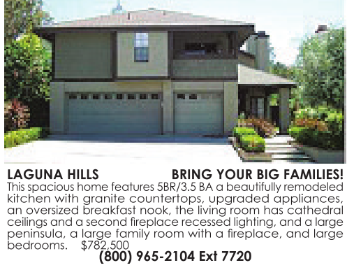 LAGUNA HILLS BRING YOUR BIG FAMILIES! This spacioushome features 5BR/3.5 BA abeautifully remodeled kitchen with granite countertops, upgraded appliances, an oversized breakfast nook, the living room has cathedral ceilings and asecond fireplace recessed lighting, and alarge peninsula, alarge family room with afireplace, and large bedrooms. $782,500 (800) 965-2104 Ext 7720