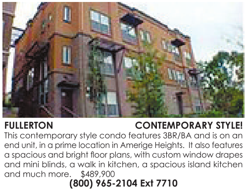 FULLERTON CONTEMPORARY STYLE! This contemporary style condo features 3BR/BA and is on an end unit, in aprime location in Amerige Heights. It also features aspacious and bright floor plans, with custom window drapes and mini blinds, awalk in kitchen, aspacious island kitchen and much more. $489,900 (800) 965-2104 Ext 7710