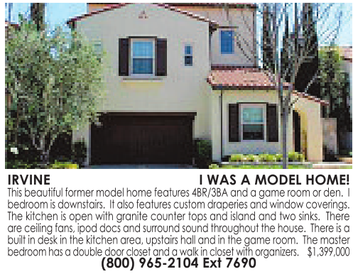 IRVINE IWAS AMODEL HOME! This beautiful former model home features 4BR/3BA and agame room or den. Ibedroom is downstairs. It also features custom draperies and window coverings. The kitchen is open with granite counter tops and island and two sinks. There areceiling fans, ipod docs and surround sound throughout the house. Thereisa built in desk in the kitchen area, upstairs hall and in the game room. The master bedroom has adouble door closet and awalk in closet with organizers. $1,399,000 (800) 965-2104 Ext 7690