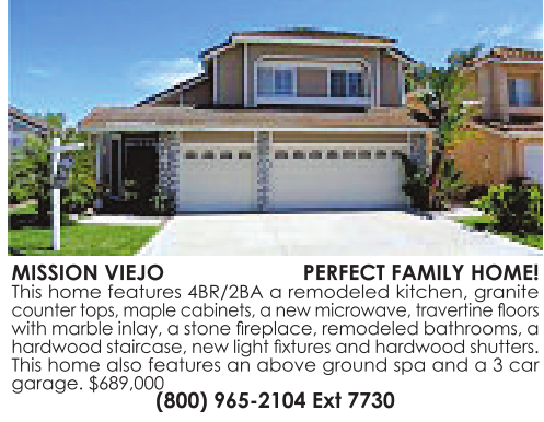 MISSION VIEJO PERFECT FAMILY HOME! This home features 4BR/2BA aremodeled kitchen, granite counter tops, maple cabinets, anew microwave, travertine floors with marble inlay, astone fireplace, remodeled bathrooms, ahardwood staircase, new light fixtures and hardwood shutters. This home also features an above ground spa and a3car