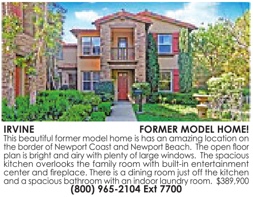 IRVINE FORMER MODEL HOME! (800) 965-2104 Ext 7700 This beautiful former model home is has an amazing location on the border of Newport Coast and Newport Beach. The open floor plan is bright and airy with plenty of large windows. The spacious kitchen overlooks the family room with built-in entertainment center and fireplace. There isadining room just off the kitchen and aspacious bathroom with an indoor laundry room. $389,900