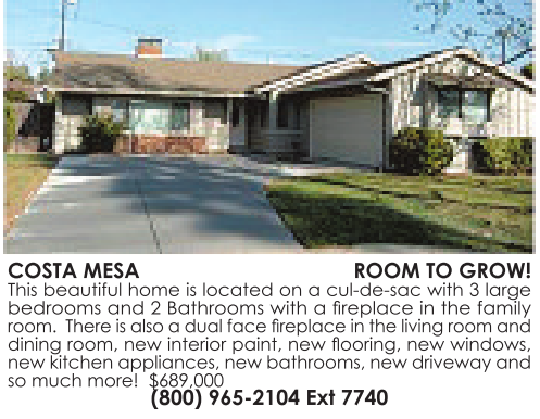 COSTA MESA ROOM TO GROW! This beautiful home is located on acul-de-sac with 3large bedrooms and 2Bathrooms with afireplace in the family room. Thereisalso adual face fireplace in the living room and dining room, new interior paint, new flooring, new windows, newkitchen appliances, new bathrooms, new driveway and so much more! $689,000 (800) 965-2104 Ext 7740