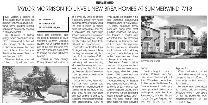 For more information about Summerwind or to join the priority list before the community opens on July 13, please visit www. tmsummerwind.com or call (714) 783-1802.