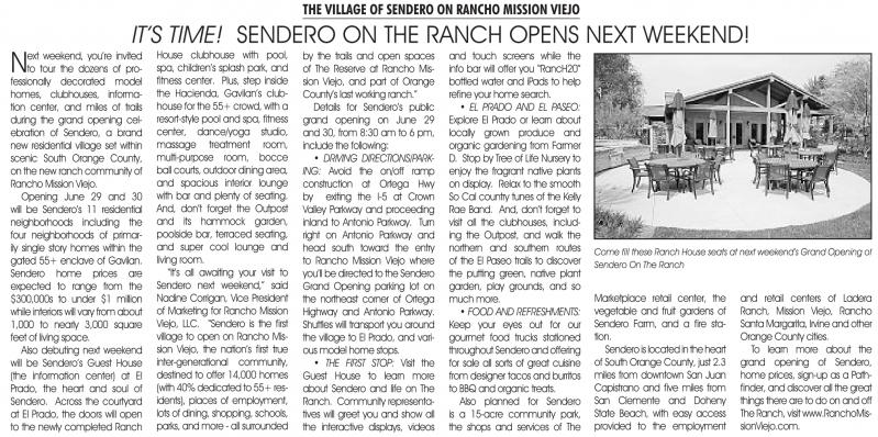 “It’s all awaiting your visit to Sendero next weekend,” said nadine Corrigan, Vice President of Marketing for Rancho Mission Viejo, LLC. “Sendero is the first village to open on Rancho Mission Viejo, the nation’s first true
