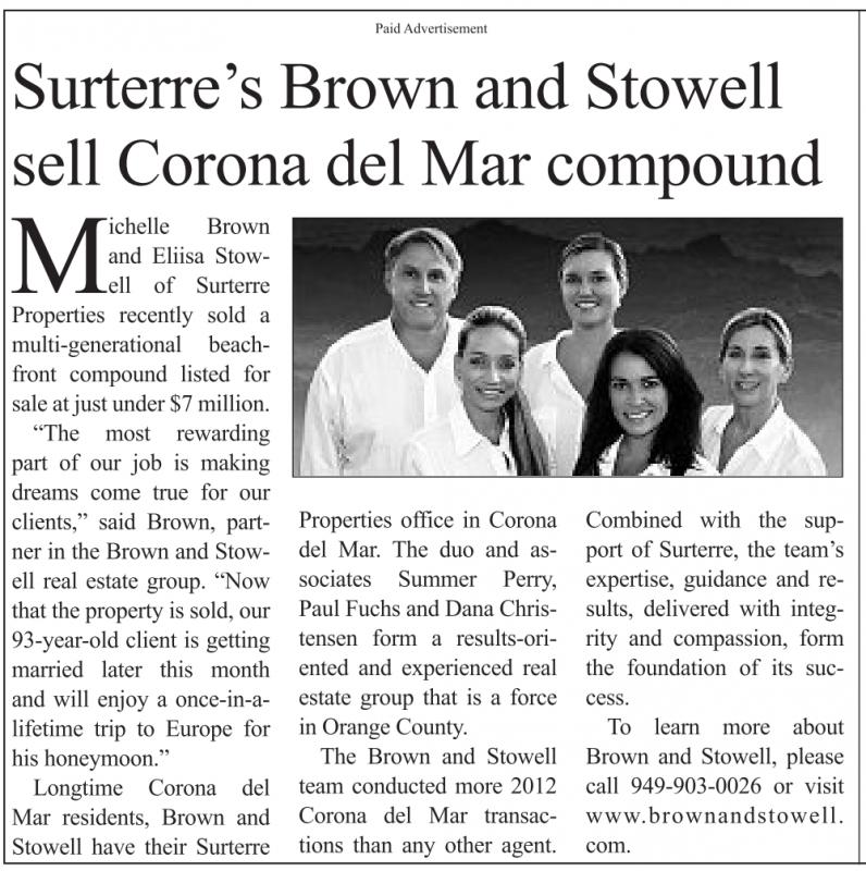 Surterre’s Brown and Stowell sell Corona del Mar compound Michelle Brown and Eliisa Stowell of Surterre Properties recently sold amulti-generational beachfront compound listed for sale at just under $7 million. “The most rewarding part of our job is making dreams come true for our clients,” said Brown, partner in the Brown and Stowell real estate group. “Now that the property is sold, our 93-year-old client is getting married later this month and will enjoy a once-in-alifetime trip to Europe for his honeymoon.” Longtime Corona del Mar residents, Brown and Stowell have their Surterre Paid Advertisement Properties office in Corona del Mar. The duo and associates Summer Perry, Paul Fuchs and Dana Christensen form a results-oriented and experienced real estate group that is a force in Orange County. The Brown and Stowell team conducted more 2012 Corona del Mar transactions than any other agent. Combined with the support of Surterre, the team’s expertise, guidance and results, delivered with integrity and compassion, form the foundation of its success. To learn more about Brown and Stowell, please call 949-903-0026 or visit www.brownandstowell. com.