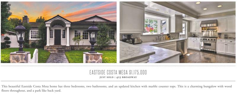 10 EASTSIDE COSTA MESA $1,175,000 just sold : 423 broadway This beautiful Eastside Costa Mesa home has three bedrooms, two bathrooms, and an updated kitchen with marble counter tops. This is a charming bungalow with wood floors throughout, and a park like back yard.