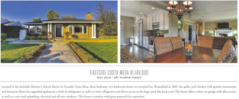 EASTSIDE COSTA MESA $1,149,000 just sold : 480 flower street Located in the desirable Mariner’s School district in Eastside Costa Mesa, three bedroom, two bathroom home on oversized lot. Remodeled in 2005, the galley style kitchen with granite countertops and limestone floors has upgraded appliances, a built in refrigerator as well as a wine refrigerator and direct access to the large, park like back yard. The home offers a three car garage with alley access, as well as a new roof, plumbing, electrical and all new windows. This home is turnkey with great potential for expansion.