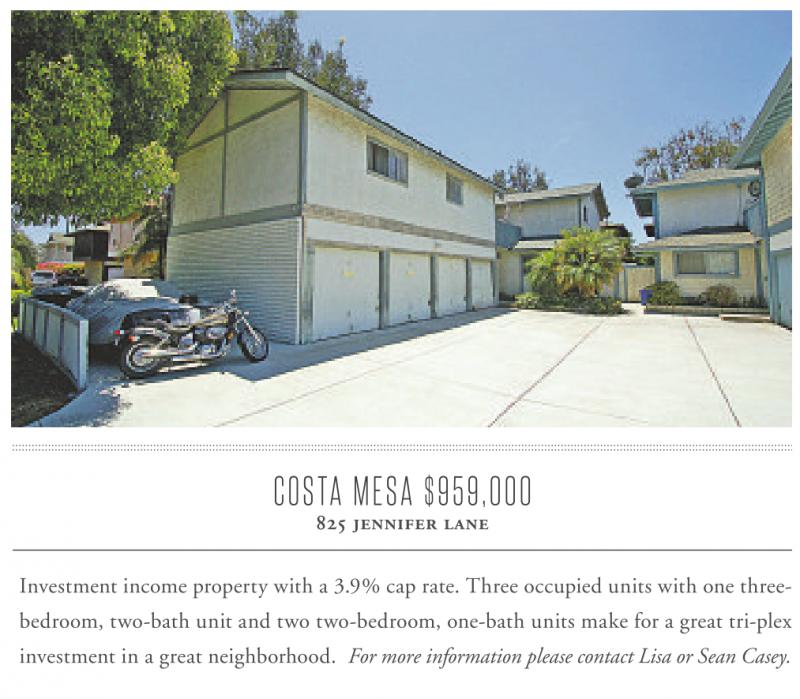 COSTA MESA $959,000 825 jennifer lane Investment income property with a 3.9% cap rate. Three occupied units with one threebedroom, two-bath unit and two two-bedroom, one-bath units make for a great tri-plex investment in a great neighborhood. For more information please contact Lisa or Sean Casey.