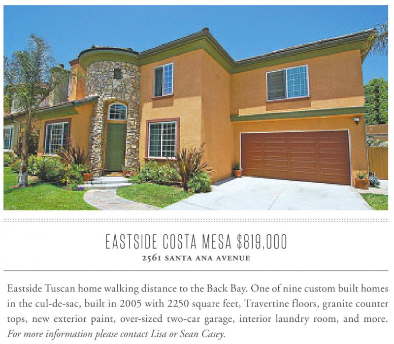 EASTSIDE COSTA MESA $819,000 2561 santa ana avenue in the cul-de-sac, built in 2005 with 2250 square feet, Travertine floors, granite counter Eastside Tuscan home walking distance to the Back Bay. One of nine custom built homes tops, new exterior paint, over-sized two-car garage, interior laundry room, and more. For more information please contact Lisa or Sean Casey.