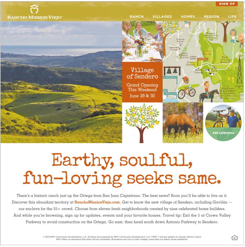 SIGN UP 15 RANCH VILLAGES HOMES REGION LIFE Village of Sendero Grand Opening This Weekend June 29 & 30 Earthy, soulful, fun-loving seeks same. There’s a historic ranch just up the Ortega from San Juan Capistrano. The best news? Soon you’ll be able to live on it. Discover this abundant territory at RanchoMissionViejo.com. Get to know the new village of Sendero, including Gavilán — our enclave for the 55+ crowd. Choose from eleven fresh neighborhoods created by nine celebrated home builders. And while you’re browsing, sign up for updates, events and your favorite homes. Travel tip: Exit the 5 at Crown Valley Parkway to avoid construction on the Ortega. Go east, then head south down Antonio Parkway to Sendero. ©2013 RMV Community Development, LLC. All plans are proposed by RMV Community Development, LLC (“RMV”) and are subject to change without notice. RMV offers no assurance that plans will be completed. Illustrations are not to scale. Imagery used does not depict racial preference.