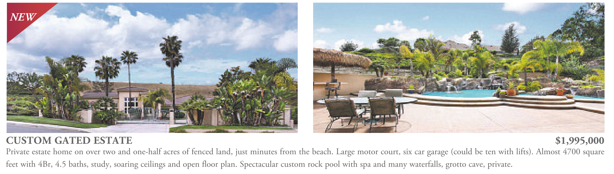 NEW CUSTOM GATED ESTATE $1,995,000 Private estate home on over two and one-half acres of fenced land, just minutes from the beach. Large motor court, six car garage (could be ten with lifts). Almost 4700 square feet with 4Br, 4.5 baths, study, soaring ceilings and open floor plan. Spectacular custom rock pool with spa and many waterfalls, grotto cave, private.