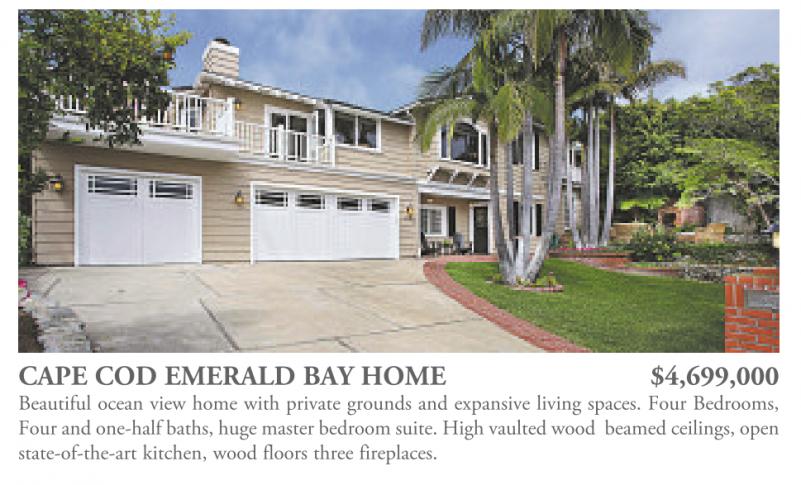 CAPE COD EMERALD BAY HOME $4,699,000 Beautiful ocean view home with private grounds and expansive living spaces. Four Bedrooms,