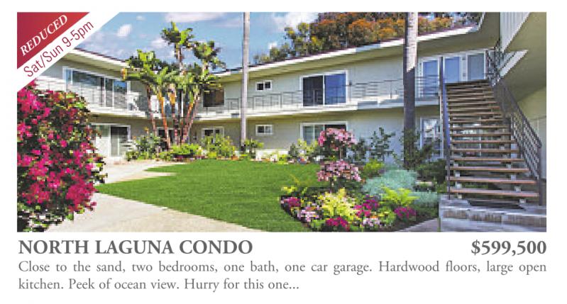 NORTH LAGUNA CONDO $599,500 Close to the sand, two bedrooms, one bath, one car garage. Hardwood floors, large open