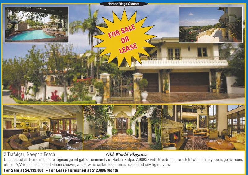 Harbor Ridge Custom 2 Trafalgar, Newport Beach Old World Elegance Unique custom home in the prestigious guard gated community of Harbor Ridge. 7,900SF with 5 bedrooms and 5.5 baths, family room, game room, office, A/V room, sauna and steam shower, and a wine cellar. Panoramic ocean and city lights view. For Sale at $4,199,000 ~ For Lease Furnished at $12,000/Month