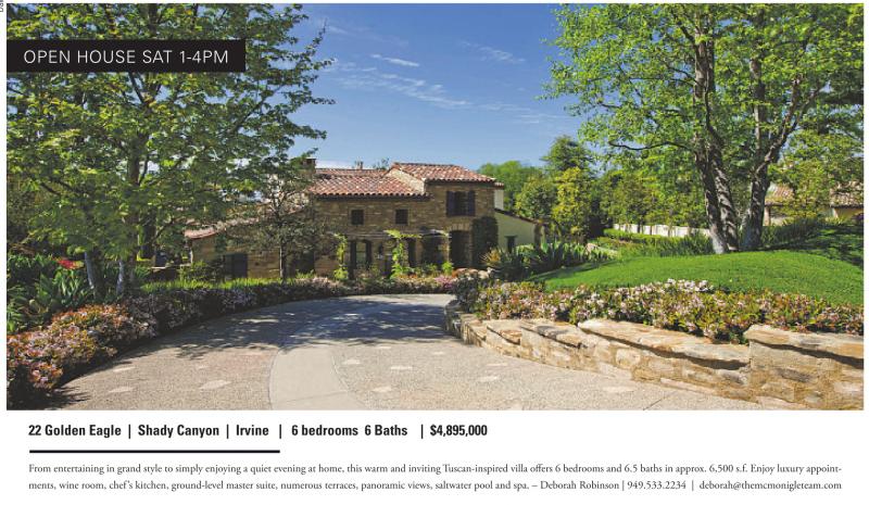 OPEN HOUSE SAT 1-4PM 22 Golden Eagle | Shady Canyon | Irvine | 6 bedrooms 6 Baths | $4,895,000 From entertaining in grand style to simply enjoying a quiet evening at home, this warm and inviting Tuscan-inspired villa offers 6 bedrooms and 6.5 baths in approx. 6,500 s.f. Enjoy luxury appointments, wine room, chef’s kitchen, ground-level master suite, numerous terraces, panoramic views, saltwater pool and spa. – Deborah Robinson | 949.533.2234 | deborah@themcmonigleteam.com