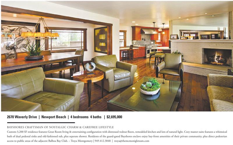 2670 Waverly Drive | Newport Beach | 4 bedrooms 4 baths | $2,695,000 BAYSHORES CRAFTSMAN OF NOSTALGIC CHARM & CAREFREE LIFESTYLE Custom-3,200 SF residence features Great Room living & entertaining configuration with distressed walnut floors, remodeled kitchen and lots of natural light. Cozy master-suite features a whimsical bath of dual pedestal sinks and old-fashioned tub, plus seperate shower. Residents of the guard-gated Bayshores enclave enjoy bay-front amenities of their private community, plus direct pedestrian access to public areas of the adjacent Balboa Bay Club. –Troya Montgomery | 949.412.3048 | troya@themcmonigleteam.com