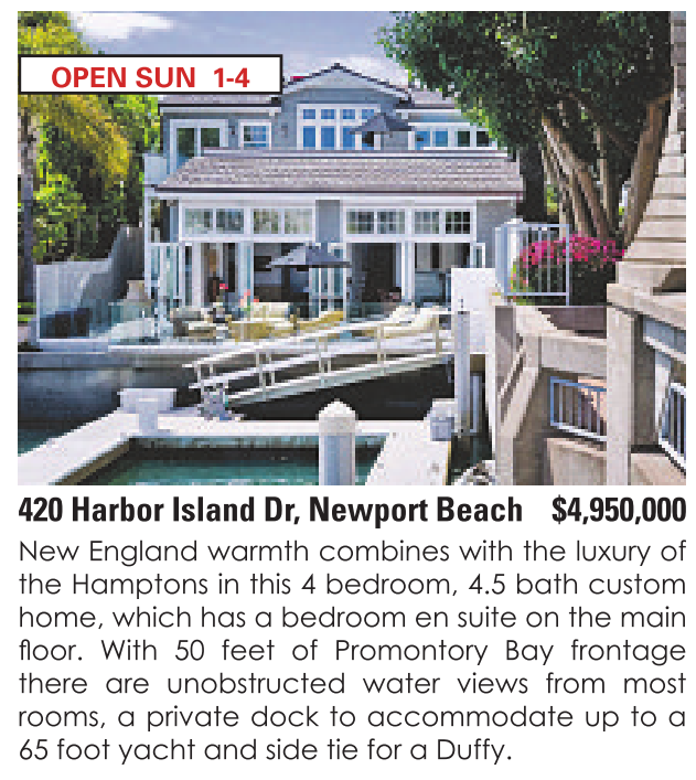 OPEN SUN 1-4 420 Harbor Island Dr, Newport Beach $4,950,000 New England warmth combines with the luxury of the Hamptons in this 4 bedroom, 4.5 bath custom home, which has a bedroom en suite on the main there are unobstructed water views from most rooms, a private dock to accommodate up to a 65 foot yacht and side tie for a Duffy. See also