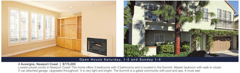 Open House Saturday, 1-5 and Sunday 1-5 4 Auvergne, Newport Coast | $775,000 Lowest priced condo in Newport Coast! This home offers 3 bedrooms with 3 bathrooms and is located in the Summit. Master bedroom with walk-in closet. 2-car attached garage. Upgraded throughout! It is very light and bright. The Summit is a gated community with pool and spa. A must see!
