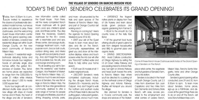 Sendero’s grand opening will be conducted June 29 and 30, from 8:30am to 6pm. To learn more about Sendero, home prices, sign-up as a Pathfinder, and discover all the great things there are to do on and off The ranch, visit www.ranchomissionViejo.com.
