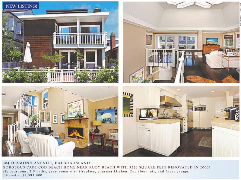 NEW LISTING! 304 DIAMOND AVENUE, BALBOA ISLAND GORGEOUS CAPE COD BEACH HOME NEAR RUBY BEACH WITH 3273 SQUARE FEET RENOVATED IN 2000! Six bedrooms, 3.5 baths, great room with fireplace, gourmet kitchen, 2nd floor loft, and 3–car garage. Offered at $2,595,000