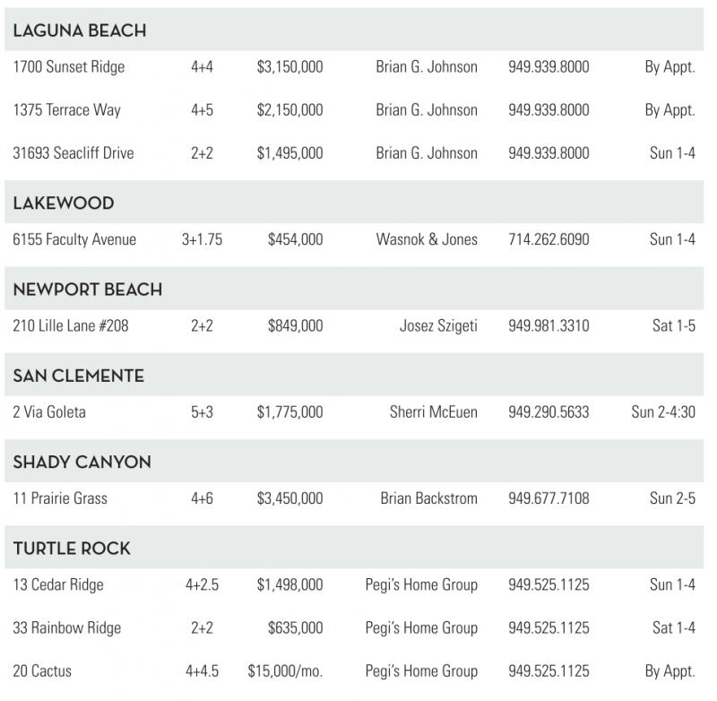 GUNA BEACH 1700 Sunset Ridge 4+4 $3,150,000 Brian G. Johnson 949.939.8000 By Appt. 1375 Terrace Way 4+5 $2,150,000 Brian G. Johnson 949.939.8000 By Appt. 31693 Seacliff Drive 2+2 $1,495,000 Brian G. Johnson 949.939.8000 Sun 1-4 KEWOOD 6155 Faculty Avenue 3+1.75 $454,000 Wasnok &Jones 714.262.6090 Sun 1-4 NEWPORTBEACH 210 Lille Lane #208 2+2 $849,000 Josez Szigeti 949.981.3310 Sat 1-5 SANCLEMENTE 2Via Goleta 5+3 $1,775,000 Sherri McEuen 949.290.5633 Sun 2-4:30 SHADYCANYON 11 Prairie Grass 4+6 $3,450,000 Brian Backstrom 949.677.7108 Sun 2-5 TURTLE ROCK 13 Cedar Ridge 4+2.5 $1,498,000 Pegi’sHome Group 949.525.1125 Sun 1-4 33 Rainbow Ridge 2+2 $635,000 Pegi’sHome Group 949.525.1125 Sat 1-4 20 Cactus 4+4.5 $15,000/mo. Pegi’sHome Group 949.525.1125 By Appt.