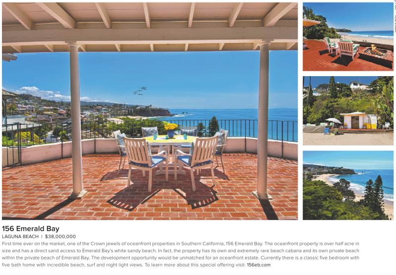 156 Emerald Bay LAGUNA BEACH | $38,000,000 First time ever on the market, one of the Crown jewels of oceanfront properties in Southern California, 156 Emerald Bay. The oceanfront property is over half acre in size and has a direct sand access to Emerald Bay’s white sandy beach. In fact, the property has its own and extremely rare beach cabana and its own private beach within the private beach of Emerald Bay. The development opportunity would be unmatched for an oceanfront estate. Currently there is a classic five bedroom with five bath home with incredible beach, surf and night light views. To learn more about this special offering visit: 156eb.com