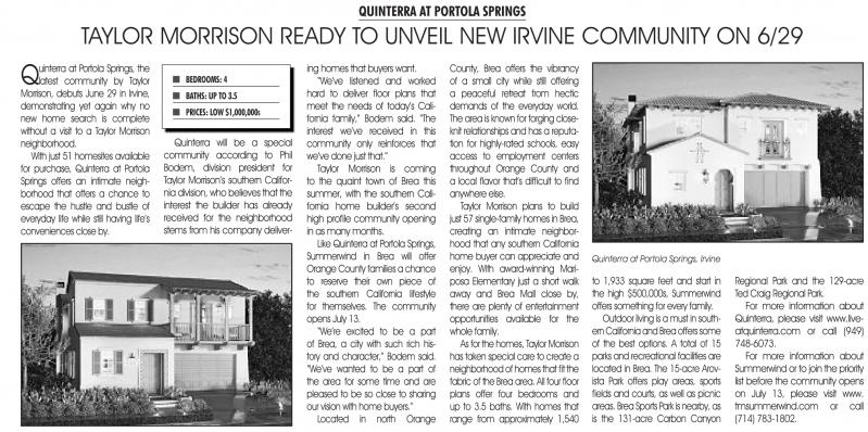 Taylor MorrISon ready To UnveIl neW IrvIne CoMMUnITy on 6/29