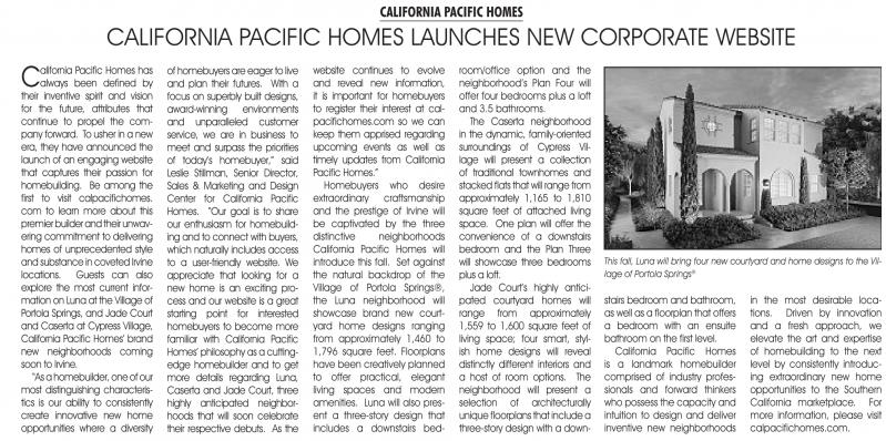 website continues to evolve and reveal new information, it is important for homebuyers to register their interest at calpacifichomes.com so we can keep them apprised regarding upcoming events as well as timely updates from California Pacific Homes.”