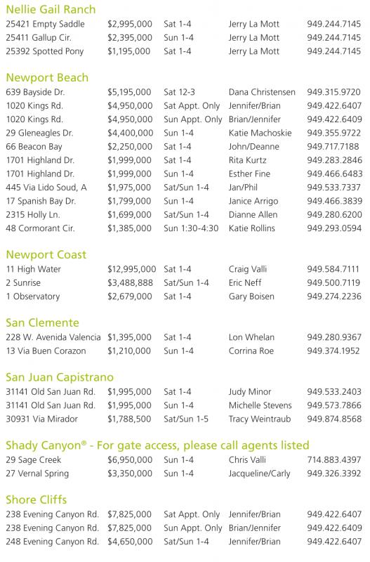 639 Bayside Dr. $5,195,000 Sat 12-3 Dana Christensen 949.315.9720 1020 Kings Rd. $4,950,000 Sat Appt. Only Jennifer/Brian 949.422.6407 1020 Kings Rd. $4,950,000 Sun Appt. Only Brian/Jennifer 949.422.6409 29 Gleneagles Dr. $4,400,000 Sun 1-4 Katie Machoskie 949.355.9722 66 Beacon Bay $2,250,000 Sat 1-4 John/Deanne 949.717.7188 1701 Highland Dr. $1,999,000 Sat 1-4 Rita Kurtz 949.283.2846 1701 Highland Dr. $1,999,000 Sun 1-4 Esther Fine 949.466.6483 445 Via Lido Soud, A $1,975,000 Sat/Sun 1-4 Jan/Phil 949.533.7337 17 Spanish Bay Dr. $1,799,000 Sun 1-4 Janice Arrigo 949.466.3839 2315 Holly Ln. $1,699,000 Sat/Sun 1-4 Dianne Allen 949.280.6200 48 Cormorant Cir. $1,385,000 Sun 1:30-4:30 Katie Rollins 949.293.0594