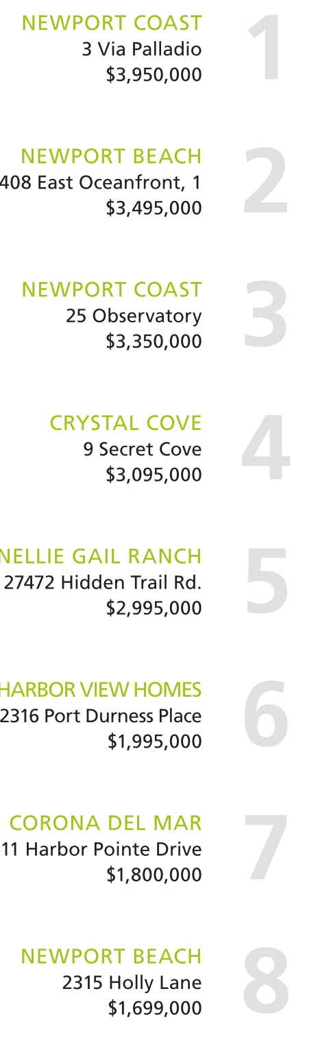NEWPORT COAST 3 Via Palladio $3,950,000 NEWPORT BEACH 408 East Oceanfront, 1 $3,495,000 1 2 NEWPORT COAST 25 Observatory $3,350,000 3 CRYSTAL COVE 9 Secret Cove $3,095,000 4 NELLIE GAIL RANCH 27472 Hidden Trail Rd. $2,995,000 5 HARBOR VIEW HOMES 2316 Port Durness Place $1,995,000 6 CORONA DEL MAR 11 Harbor Pointe Drive $1,800,000 7 NEWPORT BEACH 2315 Holly Lane $1,699,000 8