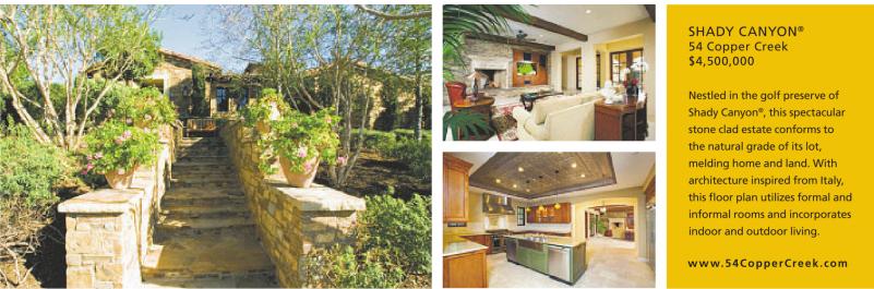 SHADY CANYON ® 54 Copper Creek $4,500,000 Nestled in the golf preserve of Shady Canyon ® , this spectacular stone clad estate conforms to the natural grade of its lot, melding home and land. With architecture inspired from Italy, this floor plan utilizes formal and informal rooms and incorporates indoor and outdoor living. www.54CopperCreek.com