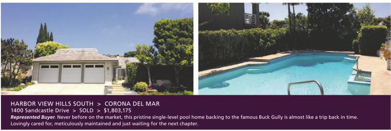 HARBOR VIEW HILLS SOUTH > CORONA DEL MAR 1400 Sandcastle Drive > SOLD > $1,803,175 Represented Buyer. Never before on the market, this pristine single-level pool home backing to the famous Buck Gully is almost like a trip back in time. Lovingly cared for, meticulously maintained and just waiting for the next chapter.