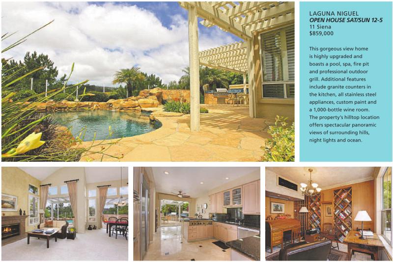 LAGUNA NIGUEL OPEN HOUSE SAT/SUN 12-5 11 Siena $859,000 This gorgeous view home is highly upgraded and boasts a pool, spa, fire pit and professional outdoor grill. Additional features include granite counters in the kitchen, all stainless steel appliances, custom paint and a 1,000-bottle wine room. The property’s hilltop location offers spectacular panoramic views of surrounding hills, night lights and ocean.