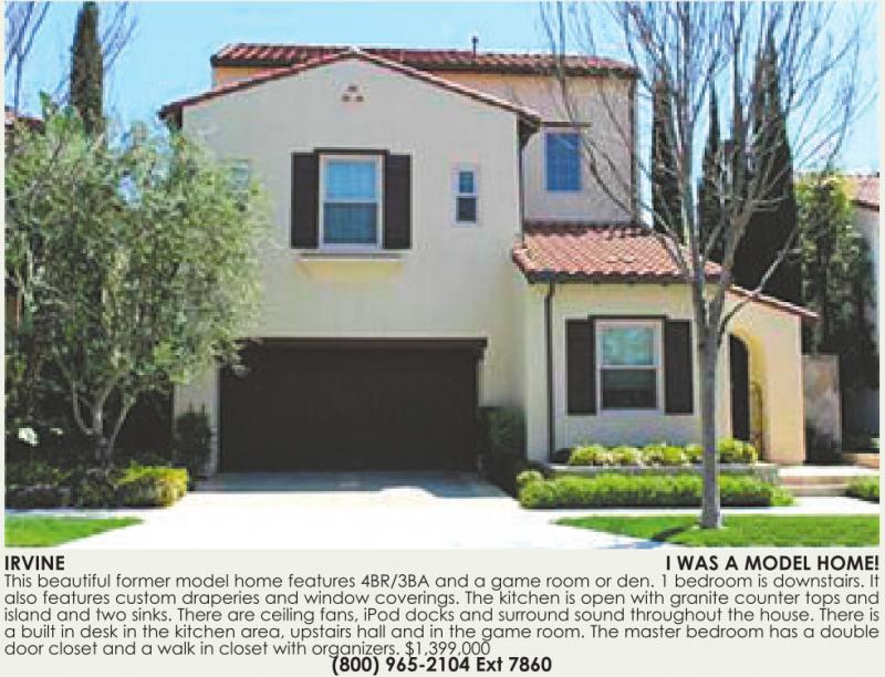 IRVINE I WAS A MODEL HOME! This beautiful former model home features 4BR/3BA and a game room or den. 1 bedroom is downstairs. It also features custom draperies and window coverings. The kitchen is open with granite counter tops and island and two sinks. There are ceiling fans, iPod docks and surround sound throughout the house. There is a built in desk in the kitchen area, upstairs hall and in the game room. The master bedroom has a double door closet and awalk in closet with organizers. $1,399,000 (800) 965-2104 Ext 7860