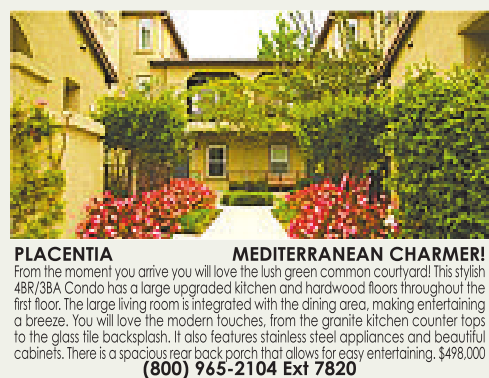 PLACENTIA MEDITERRANEAN CHARMER! From the moment you arrive you will love the lush green common courtyard! This stylish 4BR/3BA Condo has alarge upgraded kitchen and hardwood floors throughoutthe firstfloor.The large living room is integrated with the dining area, making entertaining abreeze. Youwill love the modern touches, from the granite kitchen counter tops to the glass tile backsplash. It also features stainless steel appliances and beautiful cabinets. Thereisaspacious rear back porch that allows for easy entertaining. $498,000 (800) 965-2104 Ext 7820 See also