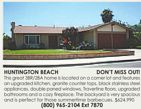 HUNTINGTON BEACH DON’T MISS OUT! This great 3BR/2BAhome is located on acorner lot and features an upgradedkitchen,granite counter tops,black stainless steel appliances, double paned windows, Travertine floors, upgraded bathrooms and acozy fireplace. The backyardisvery spacious and is perfect for those summertime barbecues. $624,990 (800) 965-2104 Ext 7870 See also