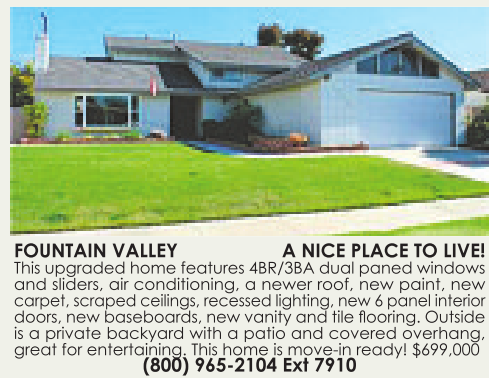 FOUNTAIN VALLEY ANICE PLACE TO LIVE! This upgraded home features 4BR/3BA dual paned windows and sliders, air conditioning, anewer roof, new paint, new carpet, scraped ceilings, recessed lighting, new 6panel interior doors, new baseboards, new vanity and tile flooring.Outside is aprivate backyard with apatio and covered overhang, great for entertaining. This home is move-in ready! $699,000 (800) 965-2104 Ext 7910