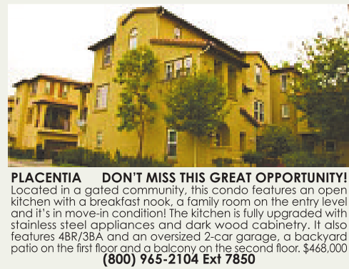 and double PLACENTIA DON’T MISS THIS GREAT OPPORTUNITY! Located inagated community, this condo features an open kitchen with abreakfast nook, afamily room on the entry level and it’s in move-in condition! The kitchen is fully upgraded with stainless steel appliances and dark wood cabinetry. It also features 4BR/3BA and an oversized 2-car garage, abackyard patio on the first floor and abalcony on the second floor.$468,000 (800) 965-2104 Ext 7850